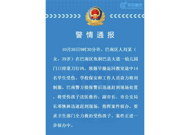 据重庆市公安局巴南区分局官方微博消息,26日9时30分许,重庆巴南区人刘某(女,39岁)在巴南区鱼洞巴县大道一幼儿园门口持菜刀行凶,致做早操返回教室途中14名学生受伤…...